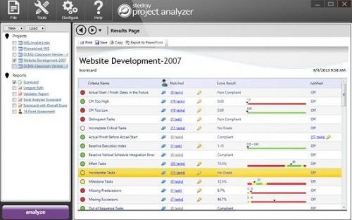 Steelray Project Analyzer is software that takes the pain out of creating, maintaining and delivering quality schedules. With Analyzer, you can evaluate your project schedule for quality and performance in minutes and produce understandable results. Schedules can be analyzed against project management best practices, internally defined best practices and government best practices. Analyzer supports Microsoft Project, Primavera P6 and UN/CEFACT XML.